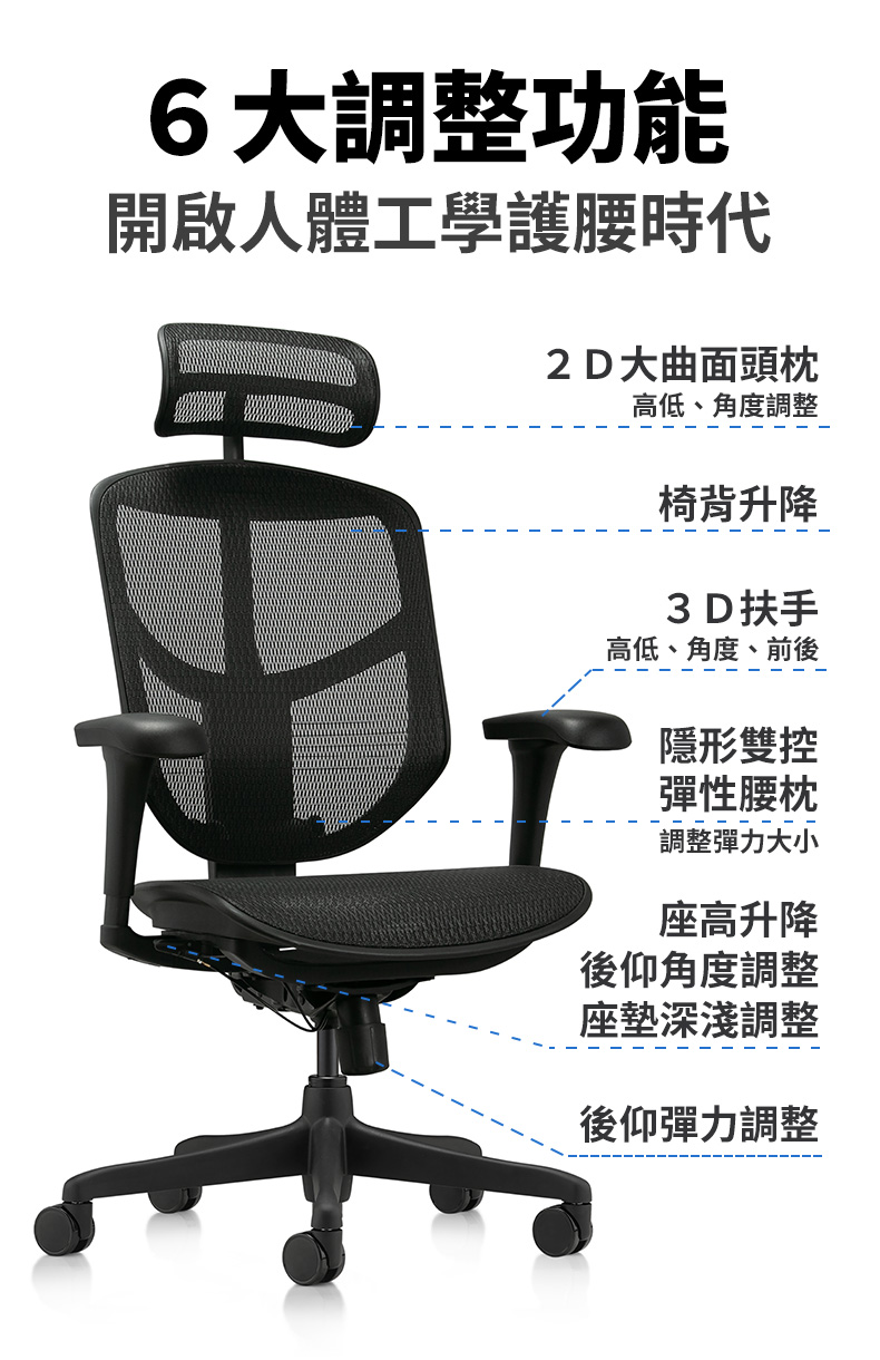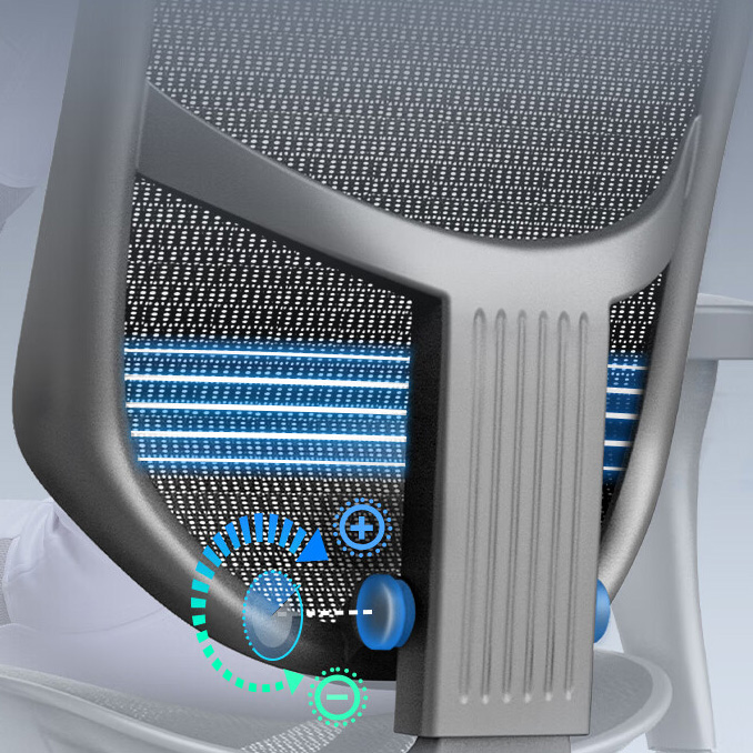 背部6檔高度微調鎖定微調,確保適用於不同坐姿需求,呵護使用者的脊椎健康。