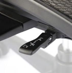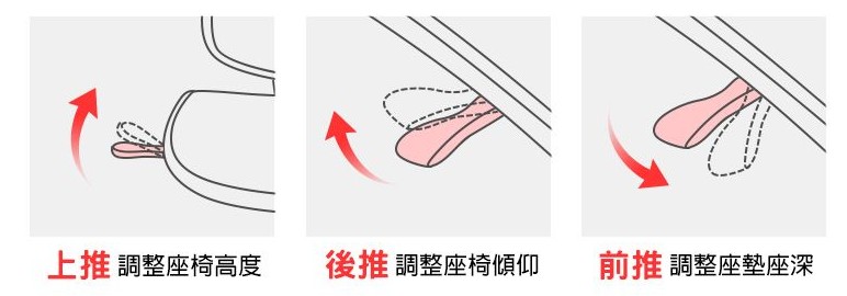 控制桿位於椅座右下方的圓形旋鈕,椅背傾仰幅度調整,順時鐘轉緊(+),逆時鐘轉鬆(-),因每個人身體體重不同或舒適度需求而修正不同力道。椅座前後撥桿,可調整後仰角度鎖定位置,依照不同後仰角度需求而改變位置。