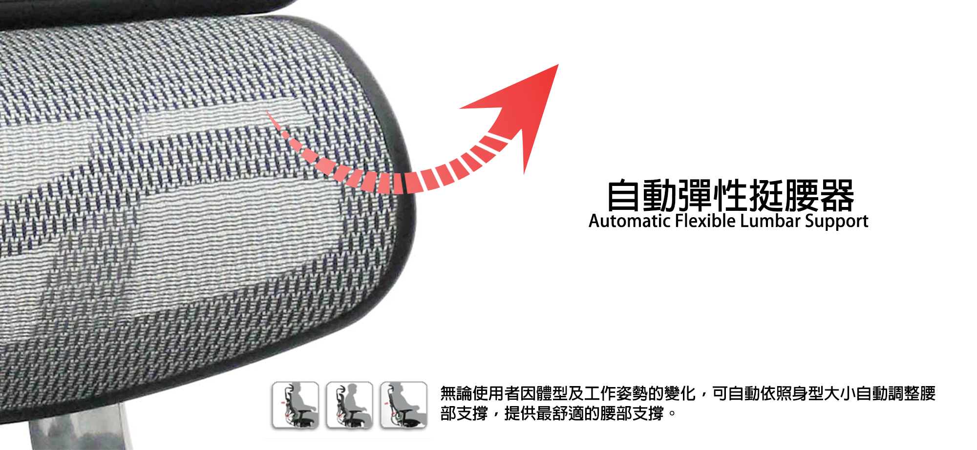 - 彈性頂腰器依照不同體重而自動調整頂腰器的前後位置,無需人工調整便可達到人體工學支撐