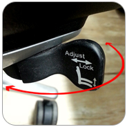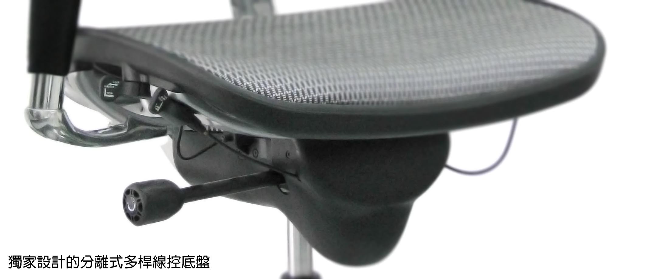 底盤操縱桿可分為三個分離式撥桿控制鍵(座墊升降調整鈕, 後仰角度鎖定調整鈕 ,座墊深度調整鈕) 和後仰柔軟力道旋轉桿。