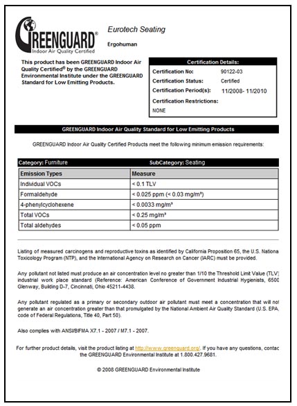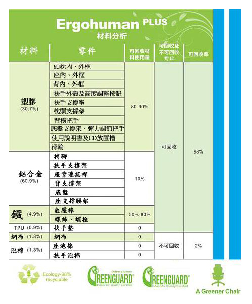 Ergohuman 人體工學椅系列-通過 GreenGuard綠色衛士合格認證 宗旨:改善室內空氣環境質量、增進大眾健康、減少有害氣體 通過綠色衛士空氣品質環保認證,可做為採購產品的依據 認證公開於綠色衛士網頁:http://www.greenguard.org/en/ProductDetail.aspx?productID=5879&includeWords=Ergohuman