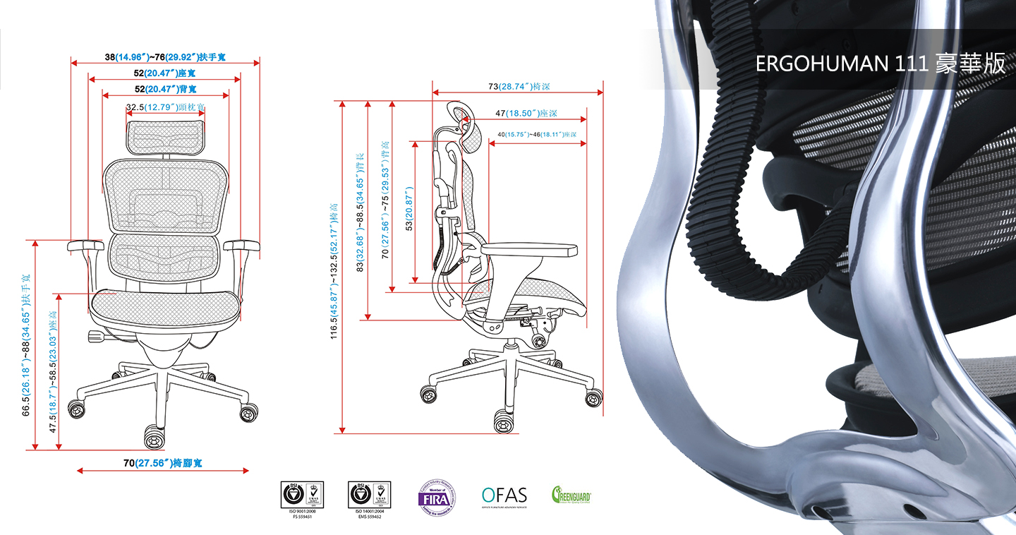ERGOHUMAN 全系列產品完全符合人體工學,榮獲10多個國家的多項專利,全系列產品均通過綠色衛士組織(Greedguard),全系列產品均通過美國辦公家具協會BIFMA產品安全性測試,及歐洲通過SGSEN1335認證測試。