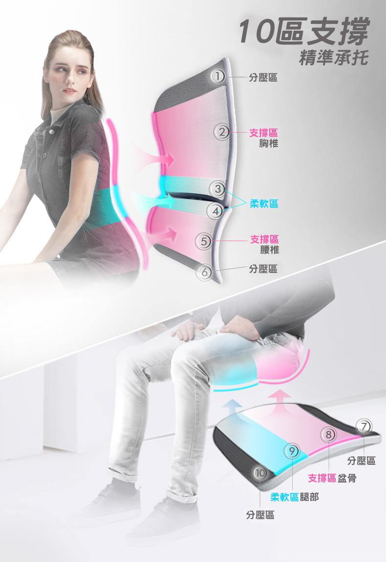 - 椅背功能採用兩截式支撐椅背,同時支撐腰際與上背,讓身體更有效率分散重量,椅背可四段高低調整,可依照身體體型與需求調整