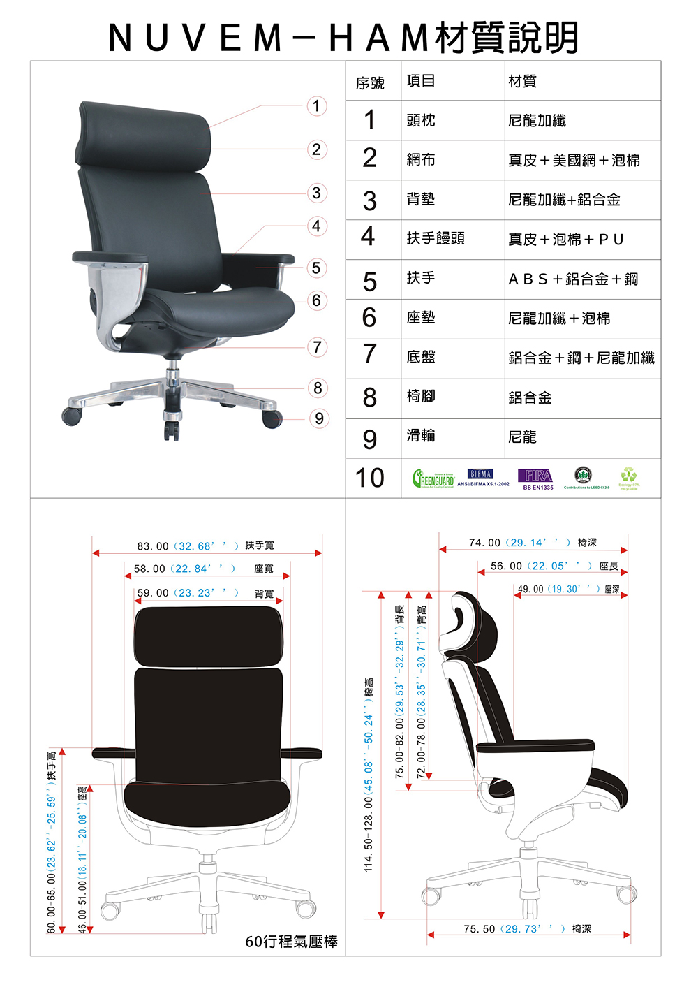 - 2.座墊角度每變化1度,背墊的變化2.7度