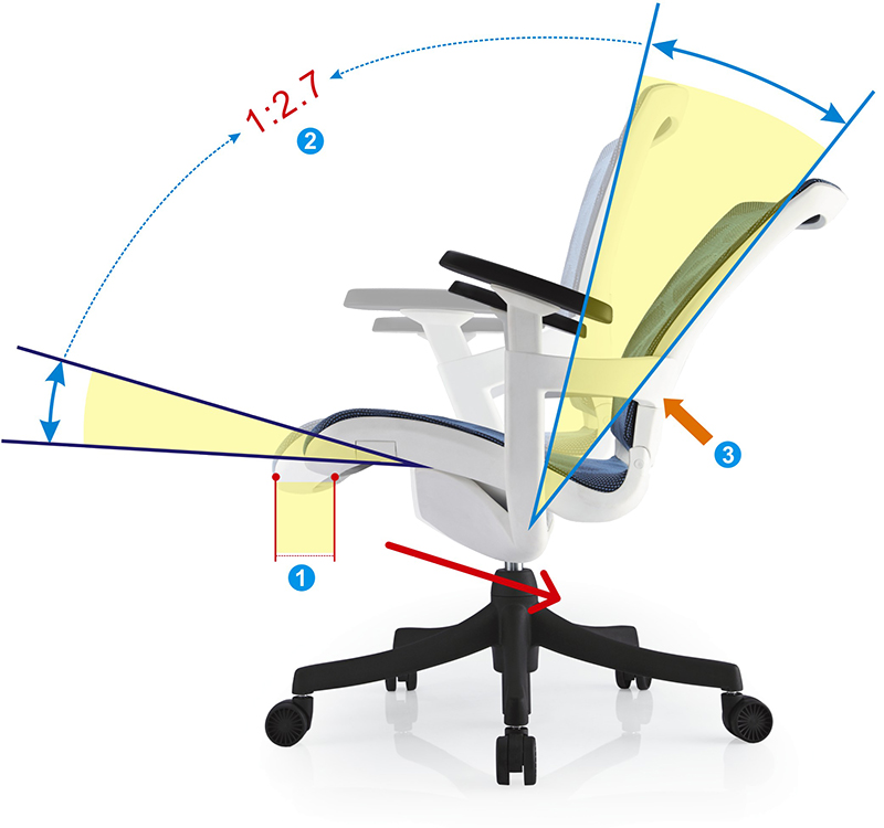 - 1.椅座會隨著人體後仰姿勢同步往下方與後方滑動,增加後仰舒適性