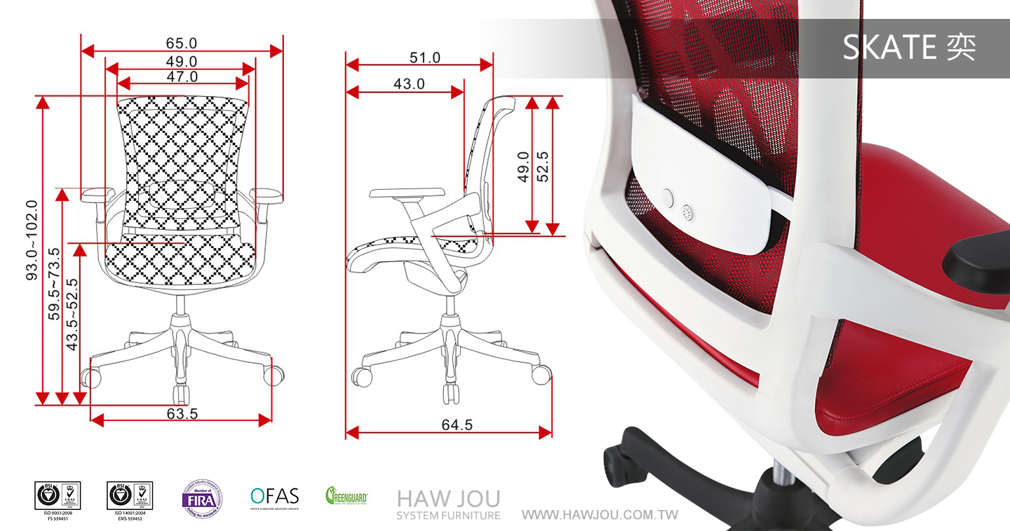 【 Skate Chair – 奕椅】改變了傳統底盤設計,引進新型進化式底盤機構,結合最新獨創的潛滑式貼合傾仰新工學,讓使用者可以在非常輕鬆的狀態向下滑動來達成椅背的後仰,更重要的是這種移動方式不會改變使用者的腰部高度,所以在滑動過程中,背部與椅背完全貼合移動,腰部不懸空,是最健康的傾仰新工學。