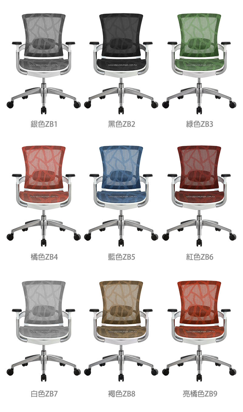 取日製3D網與美製網優點,另增加Q度與耐重度,對體重較重者尤其適合,不會坐墊坐起來會有陷下去的感覺。這款別具一格、活力十足的時尚網布產於美國,這款產品擁有全球專利權。ZB系列網布是一個突破性的創新產品,在市場上廣受歡迎,它可與我們的彩色椅輪、腳圈和座墊完美搭配。有黑色、銀灰色、綠色、橘黃色、咖啡色等多種顏色選擇。