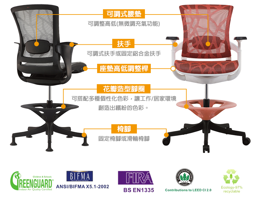 取日製3D網與美製網優點,另增加Q度與耐重度,對體重較重者尤其適合,不會坐墊坐起來會有陷下去的感覺。這款別具一格、活力十足的時尚網布產於美國,這款產品擁有全球專利權。ZB系列網布是一個突破性的創新產品,在市場上廣受歡迎,它可與我們的彩色椅輪、腳圈和座墊完美搭配。有黑色、銀灰色、綠色、橘黃色、咖啡色等多種顏色選擇。