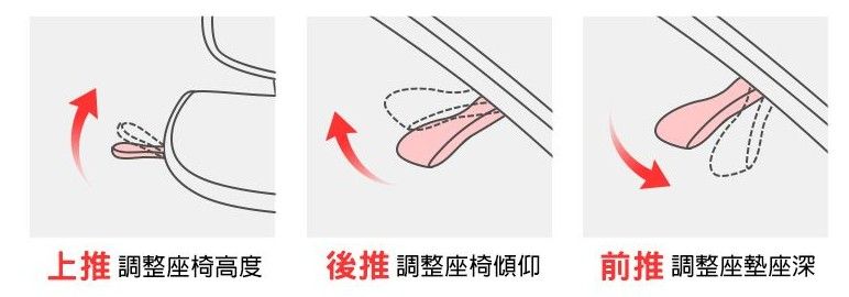 控制桿位於椅座右下方的圓形旋鈕,椅背傾仰幅度調整,順時鐘轉緊(+),逆時鐘轉鬆(-),因每個人身體體重不同或舒適度需求而修正不同力道。椅座前後撥桿,可調整後仰角度鎖定位置,依照不同後仰角度需求而改變位置。