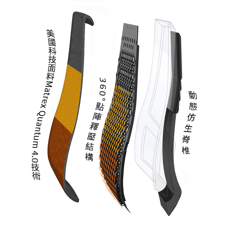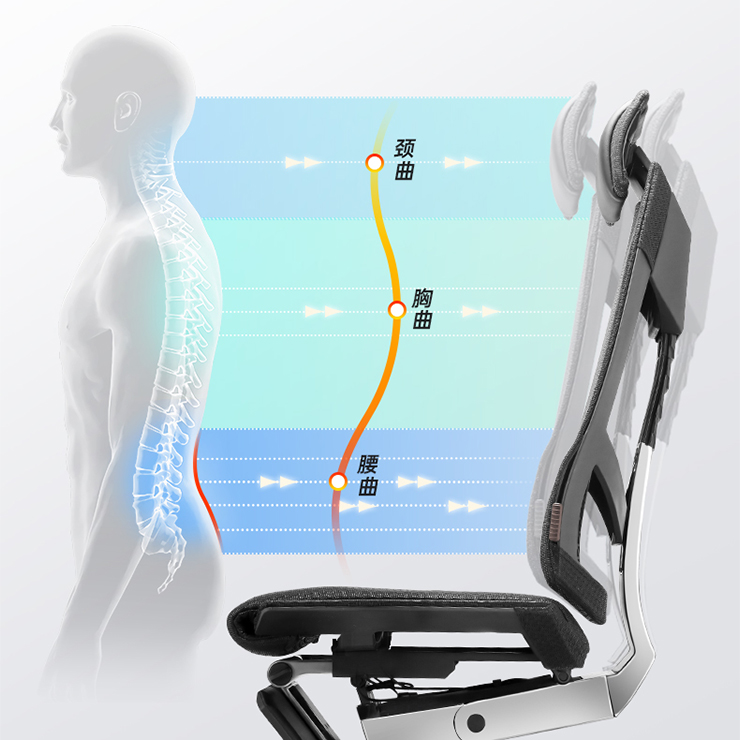 當椅背感應因子受力時,感應點可以隨著受壓方向做動態的角度變化,把壓力均勻分散到全背部,讓你獲得舒適的背部支撐,保護脊椎生理。