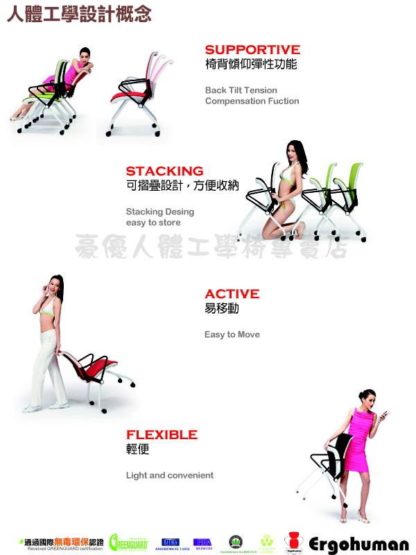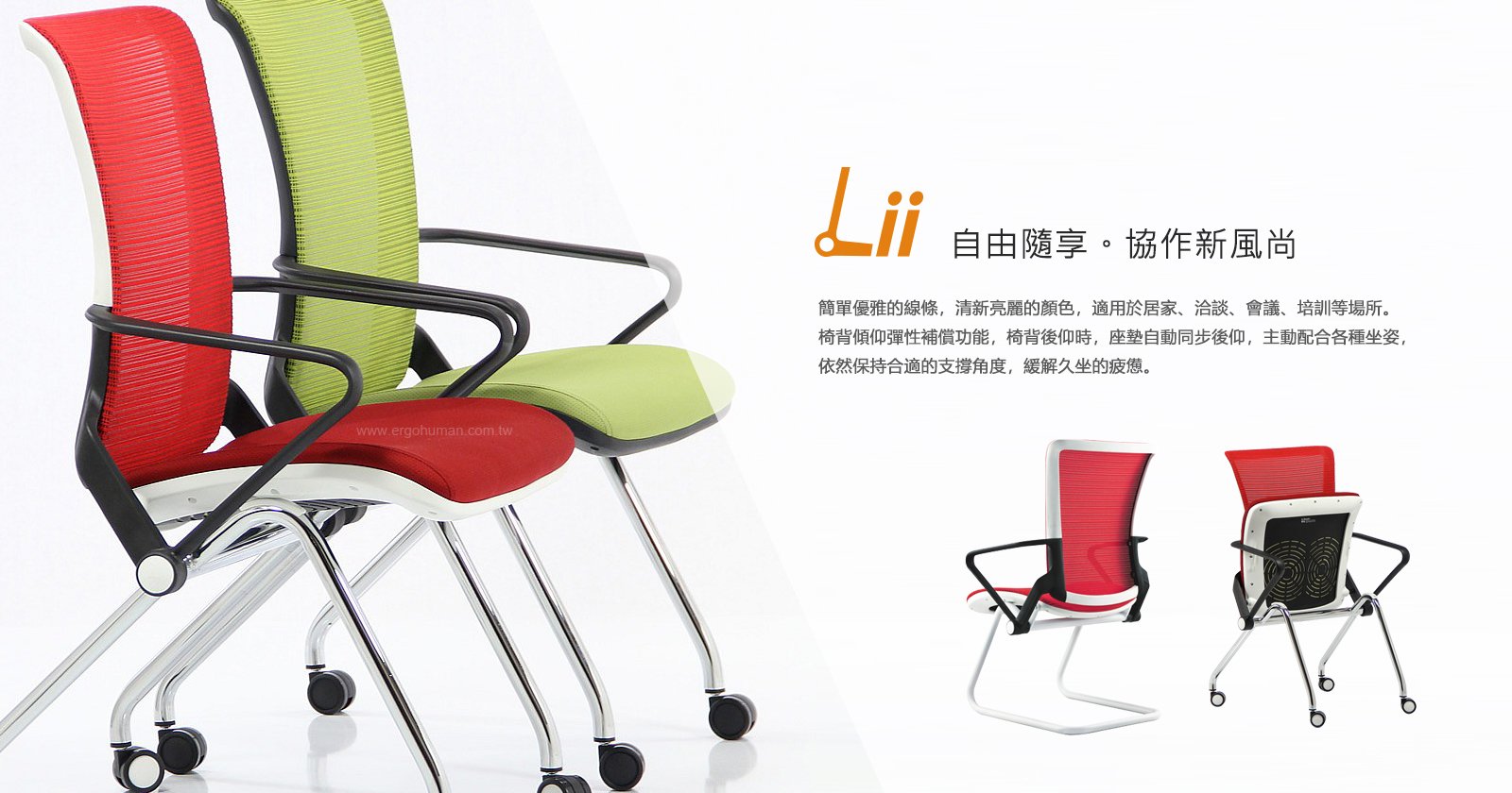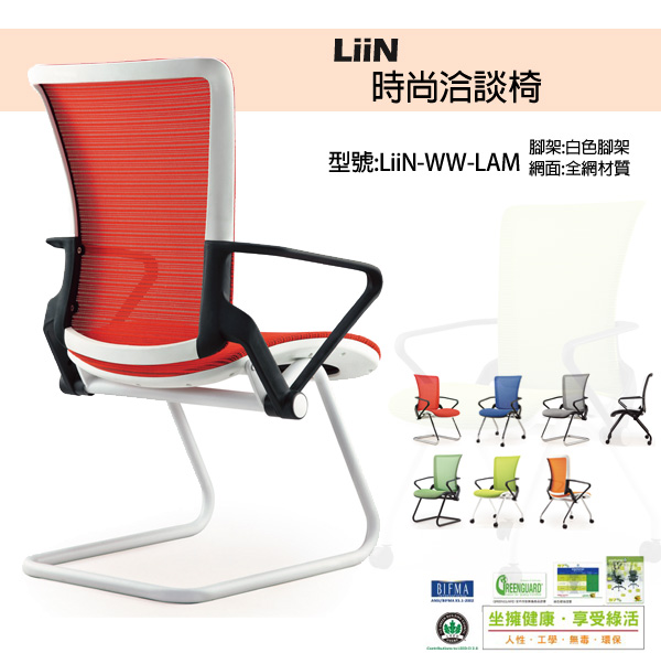 產品介紹 : Ergohuman 最新產品力做,外表搭配造型是具有簡單、獨具一樹的風格,此次LiiN洽談椅搭配的網面材質採用日本3D亮色系布面材質,有別於傳統OA辦公椅所搭配的網面色系,造形設計上表現出活潑可愛與具有輕巧感十足的恰談椅框架,更活化了整個OA辦公室與居家裝潢環境的舒適感。